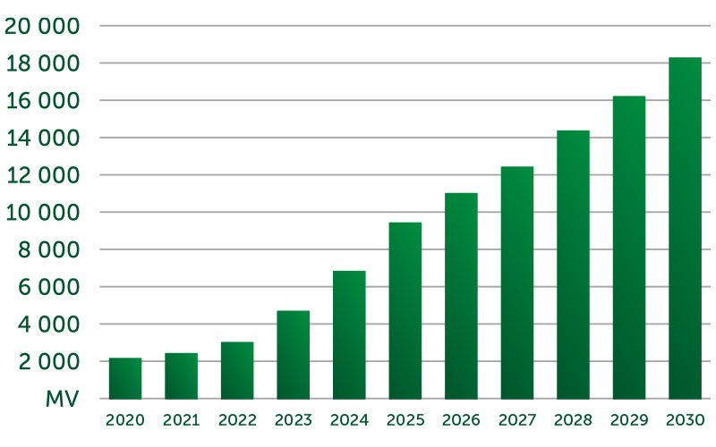 The predicted development of wind power capacity in the 2020s (Fingrid 2022).