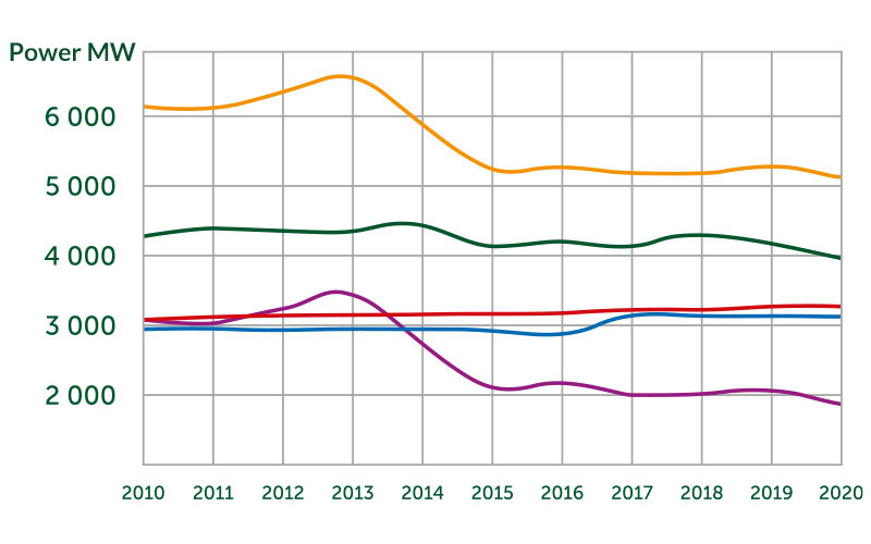 The capacity of adjustable power has decreased in the 2020s. Total regulatory power | Industry CHP | District heating CHP | Separate production | Hydropower