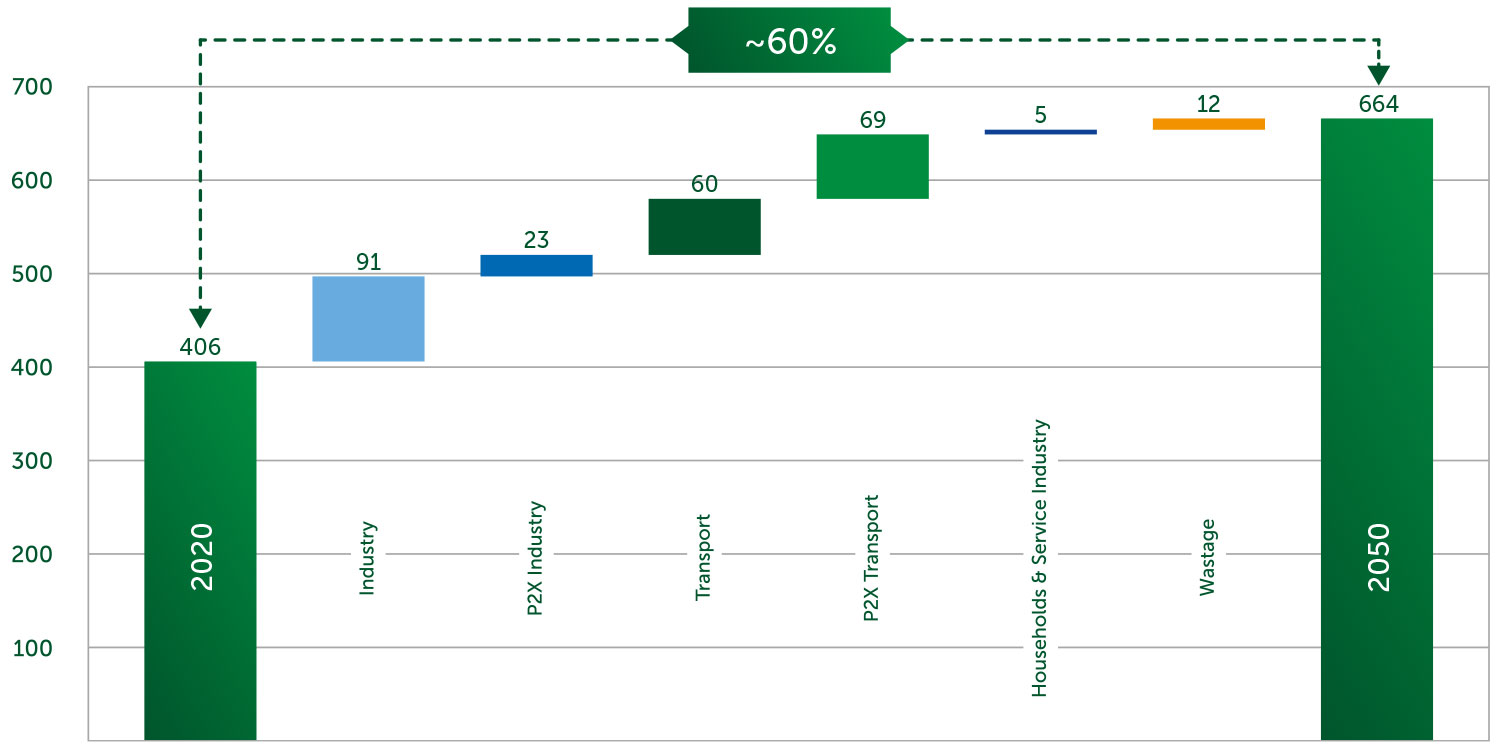 Electricity demand growth by sector in the Nordic countries in 2020 – 2060, TWh.